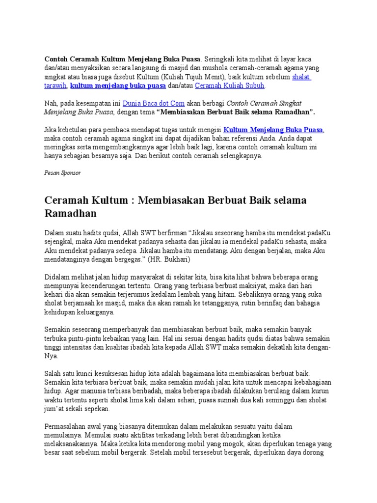 Ceramah Singkat Tentang Kisah-Kisah Menakjubkan Pilihan Allah Yang Terbaik Materi 25 Riya Terselubung 1 Berikut ini kami sajikan Kumpulan kultum dan Ceramah Ramadhan Singkat dan Praktis dan juga kumpulan khutbah jumat Ramadhan singkat lengkap dengan dalilnya. Maka dari itu Bapak Ibu harus memantapkan niat terlebih dahulu sebelum menjalankan puasa Ramadan Ceramah Tentang Rukun Puasa Bulan Ramadan yang kita nanti kini sudah di depan mata alangkah baiknya kita mempersiapkan diri untuk menyambutnya.