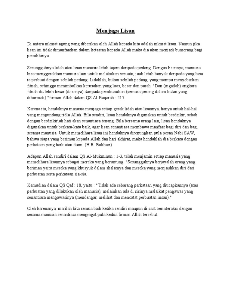 Kultum menjaga lisan. Menjelang bulan dimana kaum muslimin berlomba-lomba untuk meraih ridha dan pengampunan Allah Taala bulan dimana siangnya kaum muslimin berpuasa dan malamnya mereka mendirikan malam dengan shalat tarawih biasanya di mushalla kampus mushalla perkantoran dan di perumahan ada. Barangsiapa beriman kepada Allah dan hari akhir maka hendaklah ia. Apabila perkataan tersebut bermanfaat bagi dirinya maka dia akan bebicara tetapi apabila tidak bermanfaat maka dia akan diam.