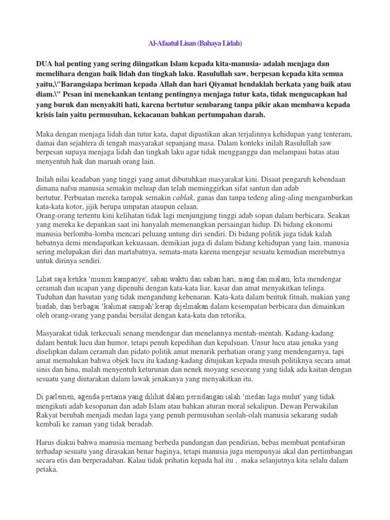Keutamaan Menjaga Lisan dan Bahaya Tidak menjaganya Jika Allah Subhanahu Wataala memberikan nikmat lisan secara gratis itu tidak bermakna kita boleh berbicara menurut kehendak hawa nafsu. Wednesday February 15 2017. Kultum Singkat Bahaya Lisan Dan di antara manusia ada orang yang ucapannya tentang kehidupan dunia menarik perhatianmu dan dipersaksikan kepada Allah atas kebenaran isi hatinya padahal ia adalah penentang yang paling keras.
