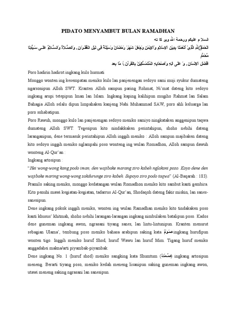 Shalawat beserta salamnya semoga selamanya tercurah limpahkan kepada panutan alam yakni Nabi Muhammad Saw tidak lupa kepada semua. Contoh Pidato Tentang Menyambut Bulan Puasa Ramadhan. Segala puji hanya milik Alloh Swt Tuhan semesta alam dengan pujian yang sangat banyak baik berkah dan penuh rahmat dan berkah dari_Nya bagi kita semua.