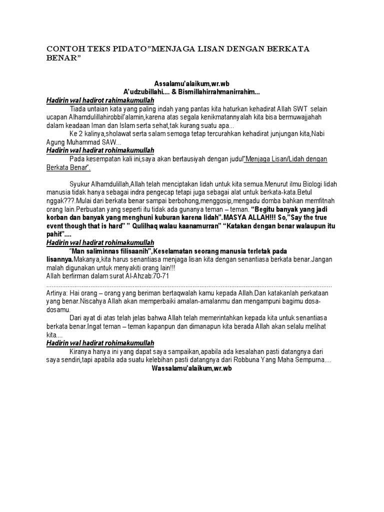 Betapa indahnya jika kita manfaatkan lisan kita untuk kebaikan. Contoh Teks Pidato Pidato memiliki artian umum sebagai suatu kegiatan yang bertujuan untuk menyampaikan gagasan dengan menggunakan lisan pada masyarakat umum. Keselamatan manusia terletak dalam menjaga lisannnya Pepatah itu mengingatkan sedemikian kuat hubungan antara keselamatan seseorang dengan kemampuan menjaga lisannya.