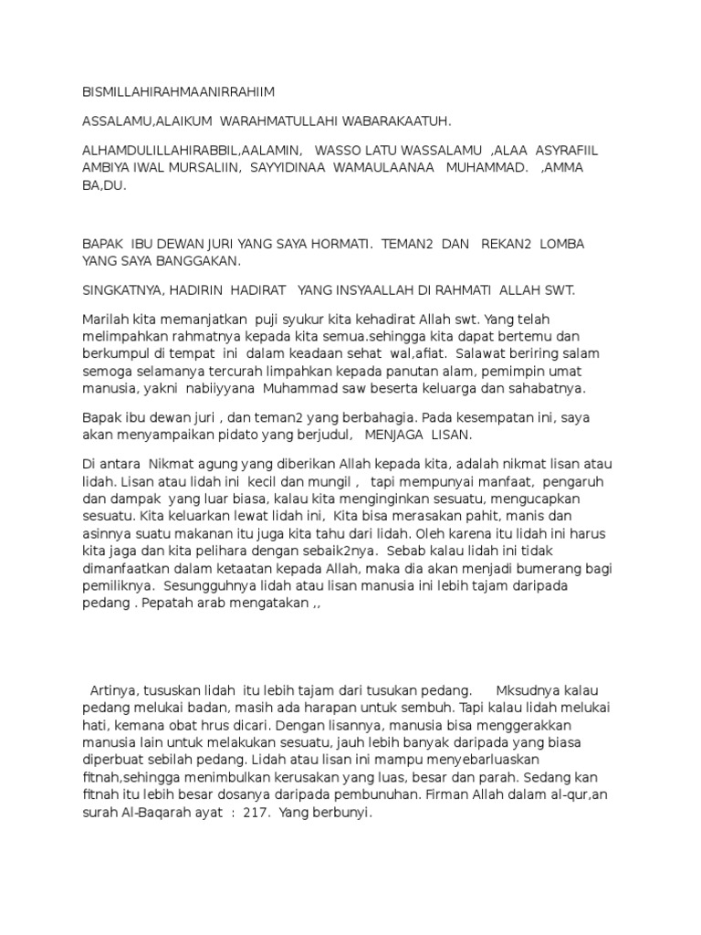 Beliau juga berkata dalam kitab yang sama hal146 Hal ini menunjukkan bahwa menjaga lisan dan senantiasa mengontrolnya merupakan pangkal segala kebaikan. Pada kesempatan yang penuh barokah ini saya akan menyampaikan pidato yang bertema Menjaga Lisan. Hanan Attaki Pidato bahasa indonesia Contoh Pidato Agama Menjaga Lisan Pidato Bahasa Indonesia tulislah sebuah naskah pidato untuk mengajak teman2 mu menjaga kelangsungan hewan langka - Brainlycoid Pidato peranan pemuda DOC Assalamualaikum Warahmatullahi Wabarakatuh Ayu Fachrisya II - Academiaedu Konsultasi Syariah.