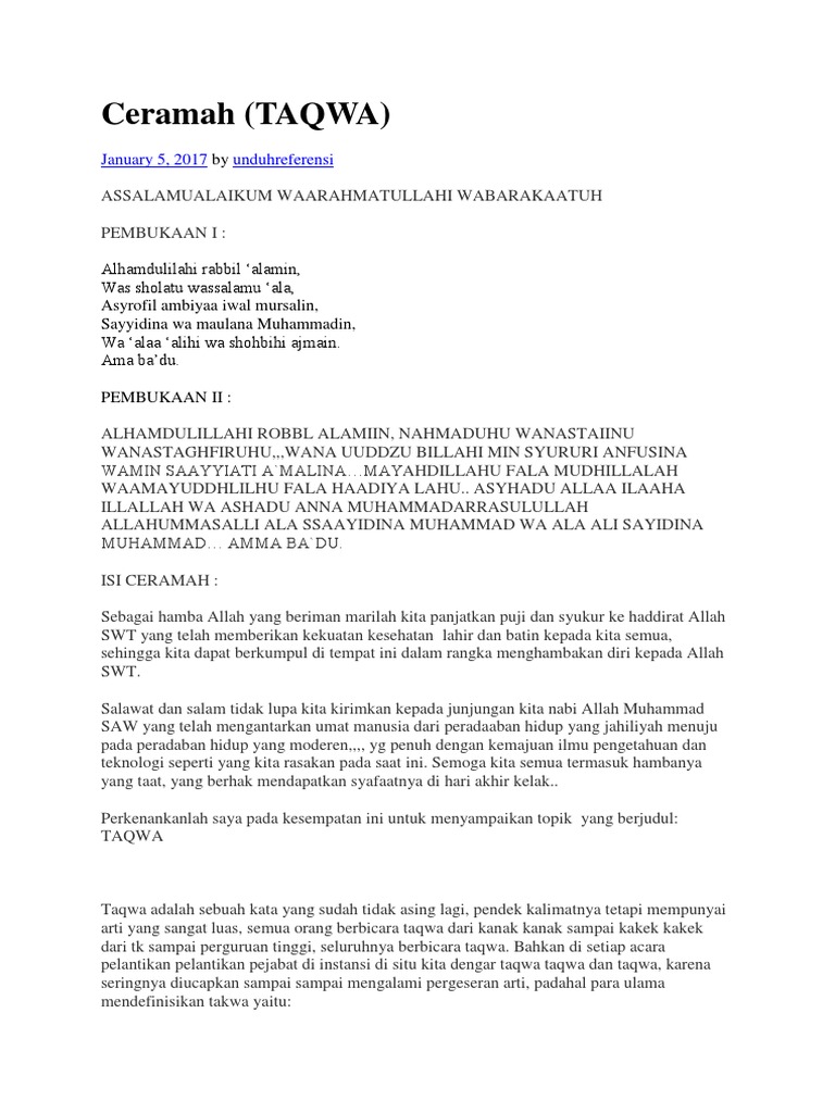 9 Contoh Teks Ceramah Singkat Berbagai Topik. Takwa Kepada Allah Dengan Berbakti Kepada Orang Tua. Seluruh ibadah ketundukkan kepada Allah baik mahdhah atau ghair mahdhah ak.