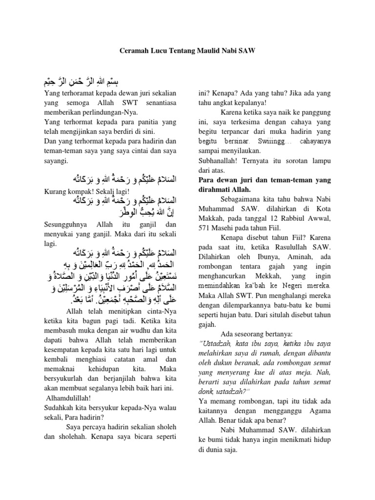 Ceramah Lucu Tentang Maulid Nabi SAW حبيسحم الح الرر يحمحن الرر ححييم Yang terhoramat kepada dewan juri sekalian yang semoga Allah SWT senantiasa memberikan perlindungan-Nya. Yang Pertama Allah swt meminta Nabi saw. Diantaranya dalam al-Quran surat Yunus ayat 58 dan surat al-Abiya ayat 107.