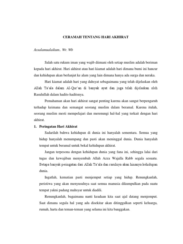Surga sebagai balasan bagi orang-orang yang telah mempersiapkan bekal dengan baik dan neraka sebagai tempat. Contoh Ceramah Singkat Ceramah atau pidato keagamaan adalah ceramah yang dilakukan oleh ahli agama atau biasa disebut ustad yang notabennya mempunyai ilmu agama lebih dan dibagikan kepada orang lain dengan tujuan agar banyak yang paham dan mengerti ilmu agama tersebut. AKURATCO Hari kiamat dikenal banyak orang sebagai hari akhir kehidupan di dunia bagi seluruh alam.
