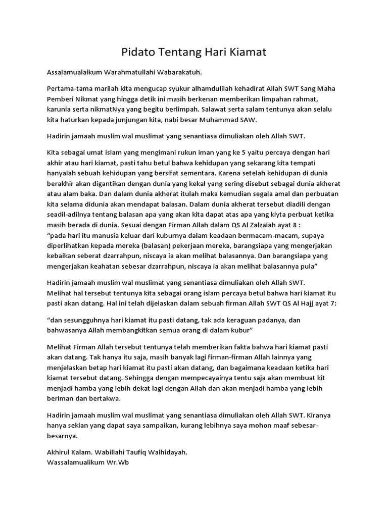 Pidato Kultum Kiamat Kementerian Pendidikan dan Kebudayaan Republik Indonesia Pidato DOC Pidato Agama Islam muammar subhan - Academiaedu sejarah. Contoh Pidato Perpisahan Bahasa Sunda Terbaru. Naskah pidato tentang hari kiamat - Dalam agama kita yaitu agama Islam dunia yang kita tinggali ini hanyalah bersifat sementara dan setelah itu kita akan memasuki yang namanya dunia akherat.