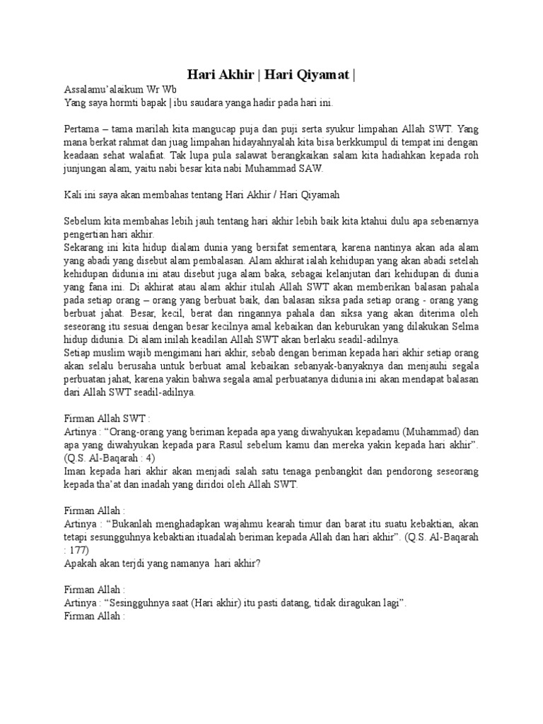 Contoh Teks Pidato tentang hari kiamat Hari Kiamat السلام عليكم ورحمة الله وبركاته بسم الله الرحمن الرحيم الحمد لله رب العالمي. Persiapan Menuju Hari Akhir. Rukun Iman itu ada 6 yaitu 1.