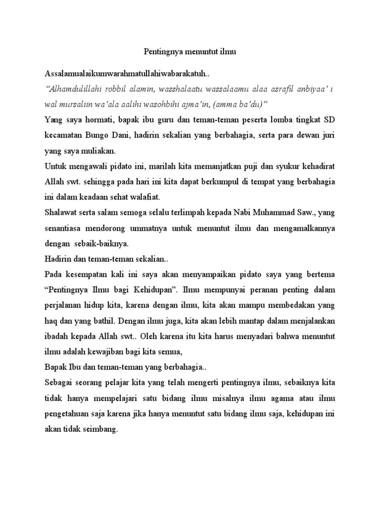 Semua orang pantas mendapatkan ilmu walaupun seberapa tua mereka menerima ilmu tidak memandang dari kondisi. Contoh Pidato singkat - Pentingnya Menuntut Ilmu Assalamualaikum wrwb Alhamdulillahilladzi anama alaina bi nimatil iman wal islam. Allah SWT sangat menyukai hambanya yang pandai dan Allah SWT akan lebih senang lagi jikalau hambanya dapat mengajarkan dan membagikan kepada orang lain.