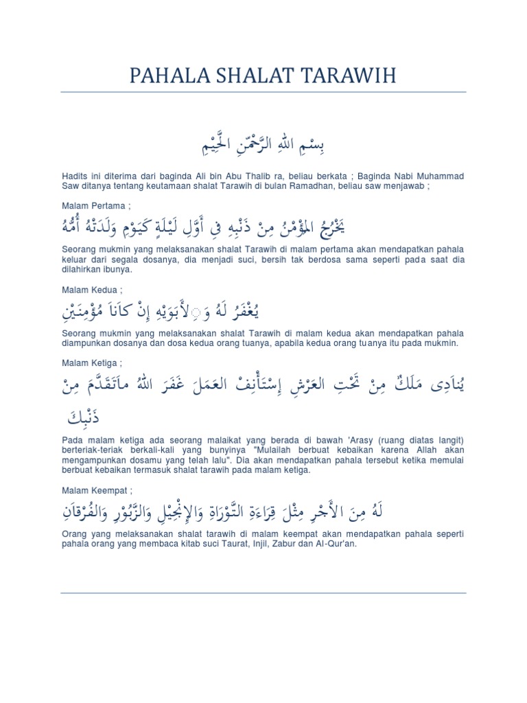 Barangsiapa yang menunaikan shalat pada malam bulan Ramadlan shalat tarawih dengan penuh keimanan dan mengharap pahala dari Allah maka dosa-dosanya yang lalu akan diampuni. Nabi Saw ditanya tentang keutamaan shalat Tarawih di bulan Ramadhan Nabi bersabda 1 Barang siapa yang melaksanakan shalat Tarawih pada malam pertama 1 Ramadhan Allah Swt akan mengampuni dosanya seperti bayi baru dilahirkan ibunya. Pada beberapa Waktu yang lalu kami telah menposting hadits PALSU tentang keutamaan sholat Tarawih Dari malam pertama hingga malam ketiga puluh terakhir dari bulan Romadhon.