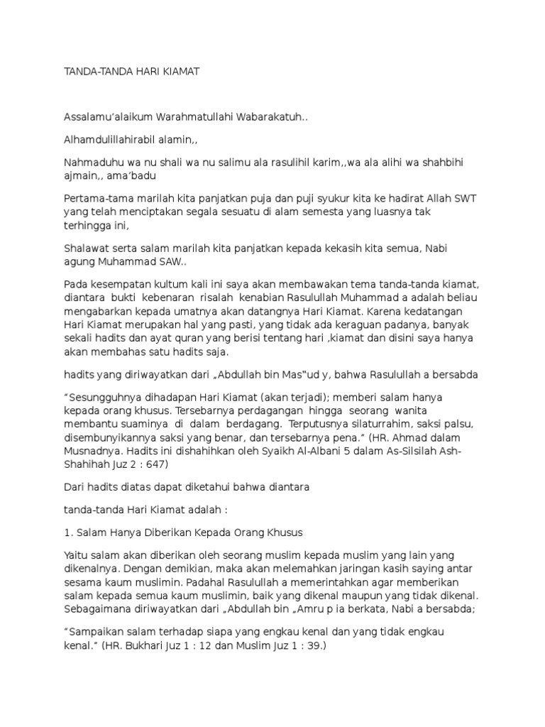 Kultum singkat tentang hari kiamat. Kumpulan Kultum Ramadhan. Dan Apabila digunakan untuk Materi Khutbah Jumat maka Judul Kultum ini tinggal mnyempurnakan Rukun Khutbahnya dan menambah Khutbah dua. Sesungguhnya pertama kali yang dihisab pada hamba di hari kiamat adalah sholat jika sholat tersebut baik maka baik juga seluruh amalnya jika sholatnya buruk maka buruk pula seluruh amalnya yang lain.